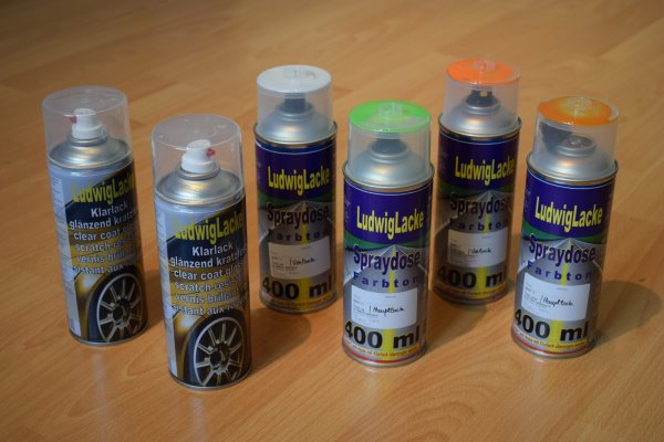11.09.2021 - Farbe für vorderen (electric orange, rechts) und hinteren (ultimate green, Mitte) Teil des Korpus ist eingetroffen. Links ist der Klarlack für die beiden Lacke zu sehen. Hoffentlich lässt sich der Autlolack (Effektlack) gut auf den Korpus sprayen und hoffentlich hält er auch für einen anspruchsvollen Umgang mit der Gitarre.